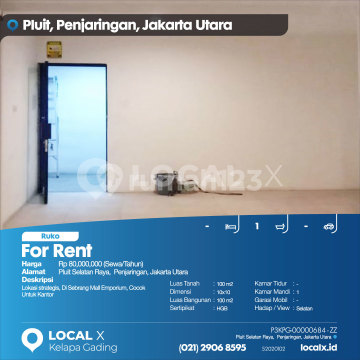 Strategic location, opposite Emporium Mall, suitable for office use For Rent Ruko Pluit Selatan Raya, Penjaringan, North Jakarta Price: Rp 8,000,xxx (Rent/Year) Property Description: Strategic location, opposite Emporium Mall, suitable for office use Land Area: 100 m² Dimensions: 10x10 Building Area: 100 m² Certificate: HGB (Right to Build) Bedrooms: - Bathrooms: 1 Car Garage: - Orientation/View: South LOCAL X Kelapa Gading ******** 021-2906-8xxx P3KPG-0000xxxx-ZZ-S