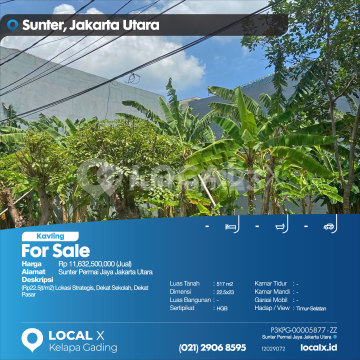 (Rp22.5 million/m2) Strategic Location, Near Schools, Near Market For Sale - For Sale Sunter Permai Jaya Plot of Land, North Jakarta Price. Rp 1,163,250,xxx (For Sale) Property Description. (Rp22.5 million/m2) Strategic Location, Near Schools, Near Market Land Area. 517 m2 Dimensions. 22.5x23 Building Area. 517 m2 Certificate. HGB (Right to Build) Bedrooms. - Bathrooms. - Car Garage. - Orientation / View. East-South LOCAL X Kelapa Gading ******** 021 2906 8xxx P3KPG-0000xxxx-ZZ-J