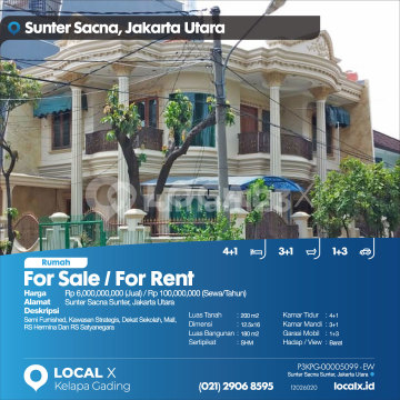 Semi-Furnished, Strategic Area, Near Schools, Mall, Hermina Hospital and Satyanegara Hospital For Sale / For Rent Sunter Sacna Sunter House, North Jakarta Price: Rp 600,000,xxxx (Sale) / Rp 10,000,xxxx (Rent/Year) Property Description: Semi-Furnished, Strategic Area, Near Schools, Mall, Hermina Hospital and Satyanegara Hospital Land Area: 200 m² Dimensions: 12.5 x 16 Building Area: 180 m² Certificate: SHM (Freehold Title) Bedrooms: 4+1 Bathrooms: 3+1 Car Garage: 1+3 Orientation/View: West LOCAL X Kelapa Gading ******** 021 2906 8xxx P3KPG-0000xxxx-EW-J/S
