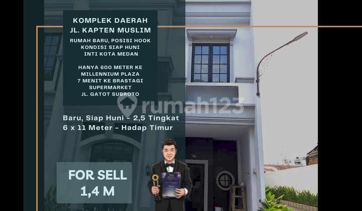 - In-laws & Wife Definitely Happy - Because the house is close to Sei Sikambing Market, Brastagi Supermarket on Jl. Gatot Subroto, Lembur Kuring Restaurant, and Coffee Shops & Cafes along Jl. Amir Hamzah - New House - Hook Position - Move-in Ready - 6 Meters Wide - East Facing - Complex area on Jl. Kapten Muslim - 24-Hour Security - Prime City Location - Strategic: v 600 Meters to Millenium Plaza v 3 Minutes from Sei Sikambing Market v 6 Minutes from Lembur Kuring Restaurant, Opal Coffee, Lim Kok Tong & Black Owl on Jl. Amir Hamzah v 7 Minutes to Brastagi Supermarket on Jl. Gatot Subroto - Selling Price: 1,400,000,000 / Negotiable _ _ _ _ _ _ _ _ _ _ _ _ _ _ _ _ - Unit / Type: 6 Meters Wide House - Hook Position - Condition: New - Move-in Ready - Position: Complex / Housing Estate - Location: Complex area on Jl. Kapten Muslim - City: Medan - District: Medan Helvetia _ _ _ _ _ _ _ _ _ _ _ _ _ _ _ _ - Number of Floors: 2.5 Levels - Land Dimensions: 6 x 11 M - Building Dimensions: 6 x 10 M - Bedrooms: 3 - Bathrooms: 4 - Certificate: SHM (Freehold Title) - Building Permit (IMB / PBG): Available - Facing: East - Electricity: 2,200 Watt - Water: PDAM (Municipal Water) _ _ _ _ _ _ _ _ _ _ _ _ _ _ _ _ - Worry-Free Because Every Property Listed for Sale & Located on Main/Protocol Roads is Covered by Full 1-Year Insurance (T&C Apply) - Peace of Mind Because Every Property Purchase is Covered by Full 1-Year Insurance (Cash Purchase) - Only Selected Properties & Developer Projects - Secure Transactions & Legality