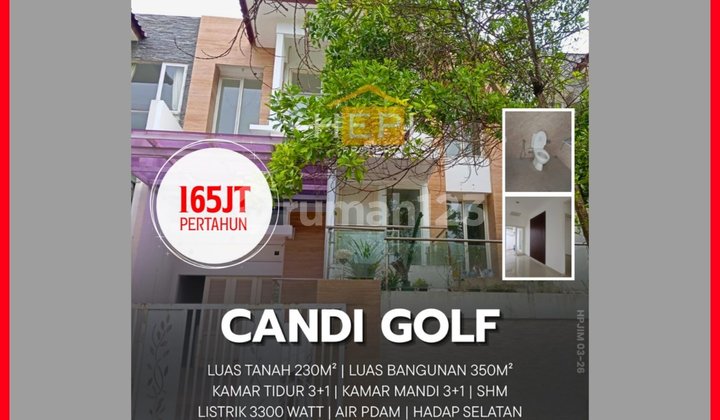 For Rent: Minimalist 2-Story House (Semi-Furnished) Candi Golf Semarang Land Area 230m² Building Area 350m² (2 stories) Bedrooms 3+1 Bathrooms 3+1 Carport for 1 car Garage for 1 car Electricity 3300 Watt/Token PDAM Water HM Certificate South Facing AC & Water Heater Kitchen Set Price 165 million/year Minimum 2 years House Condition Ready to Use, Clean & Well-Maintained Contact Swanny #jim