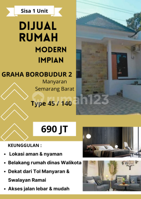 Modern Ready-to-Occupy House in Graha Borobudur 2 Manyaran - Type 45/140, Special Price 690 Million Only 1 unit left! Don't miss this golden opportunity to own your Dream Modern House in the elite and strategic area of Graha Borobudur 2, Manyaran, West Semarang. Ideal for young families prioritizing comfort and high accessibility. Building Specifications: - Building Area: 45 m² (Type 45) - Land Area: 140 m² - Price: Rp 690,000,000 (Negotiable?) Advantages & House Specifications: - Premium & Exclusive Location: Located behind the Mayor's Official Residence, ensuring a safe, green, and private environment. - Super Strategic Access: Close to the Manyaran Toll Exit and shopping centers (Busy Supermarket). Wide road access and easy for vehicles. - Modern Building Quality: - Luxurious 60x60 Granite Tile Flooring. - White Aluminum Frames and Agodoor Front Door. - Light Steel Roof with Flat Concrete Tiles. - Stone Foundation & Red Brick Walls. - Complete Facilities: Price includes electricity and water connections (PDAM/Artetis), plus a Mini Garden inside the house. Payment Method: Price includes electricity and water. CASH payment process: 1. Booking Fee (UTJ) Rp. 5,000,000. 2. 60% payment maximum 1-2 weeks after UTJ. 3. Remaining 40% payment (construction in progress). Note: Price does not include AJB fees, BPHTB, and other taxes. Contact us immediately for a site survey before it's gone!