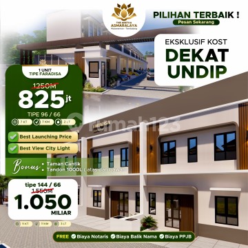 THE ARETHA ASMARALAYA Hunian Mewah Murah Berkualitas Dekat UNDIP Tembalang • Tipe Edenia 36/50 Harga Promo 425 Juta • Tipe Asmaralaya 81/60 Harga Promo 585 Juta • Tipe Faradisa 100/66 ( Kost 2 Lantai 7 KT & 7 KM ) Harga Promo 825 Juta BONUS : • Taman • Tandon 500 & 1.000 liter atas dan bawah • Free Biaya Notaris • Free Biaya balik nama • Free Biaya PPJB