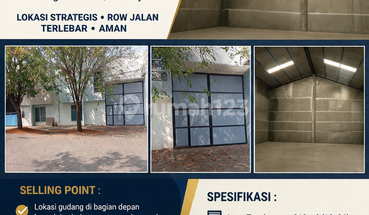 For Sale Warehouse in Safe and Lock East Ring Road Sidoarjo Selling Points: - Warehouse location at the front of the complex, not deep inside - Located on the widest row of roads Land Area: 312 m2 (12x26) Building Area: 288 m2 (12x24) Well water Electricity: 2200 watt PLN Facing North HGB Certificate Price: 3 Billion negotiable (eco) For Information Contact: Ema Property Phone/WA Number: 08133277xxxx Telegram: ******** IG: ema property