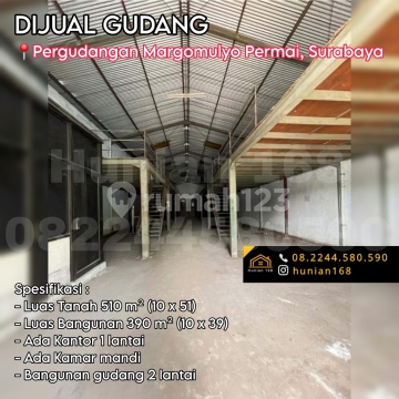 FOR SALE WAREHOUSE Margomulyo Permai Warehousing, Surabaya Several Warehouses Available WAREHOUSE 1: - Land Area 332 m² - Building Area 300 m² (10 x 30) - Includes a 2-story office - Includes a bathroom - Price 2.9 Billion WAREHOUSE 2: - Land Area 510 m² (10 x 51) - Building Area 390 m² (10 x 39) - Includes a 1-story office - Includes a bathroom - Warehouse building is 2 stories - Price 4.1 Billion WAREHOUSE 3: - Land Area 582 m² (11 x 53) - Building Area 484 m² (11 x 44) - Includes a 1-story office - Includes a bathroom - Price 5.75 Billion Added Value: - Flood-Free and Ready to Use - 100 meters to toll road access - 5 minutes to port access - 10 minutes to central Surabaya - Can be used as a factory / garage / workshop - Can be used as an office / warehouse