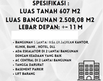 Gedung Disewa Surakarta DISEWAKAN Building / Bangunan super mewah dan terawat di tengah Kota Solo Bisa untuk Hotel, Gym, Kantor, Bank, dll Total Bangunan 5 Lantai (1 Lantai Basement untuk Parkir) Ada 6 Unit Ekskalator dan 1 Unit Lift Barang AC Central Tangga Darurat Parkir Luas Listrik 55.000 Watt Siap Pakai tidak perlu Renov sama sekali Di Setiap Lantai ada Toilet Ada Ruangan untuk Staff Luas Tanah 607m2 Luas Bangunan 2.500m2 SIAP PAKAI