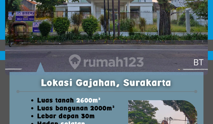 Land area 2600m² Building area 2000m² Front width 30m Location Gajahan, Surakarta - South facing - Electricity 66000 - Well water Rental price 2B/year negotiable Selling price 65B negotiable