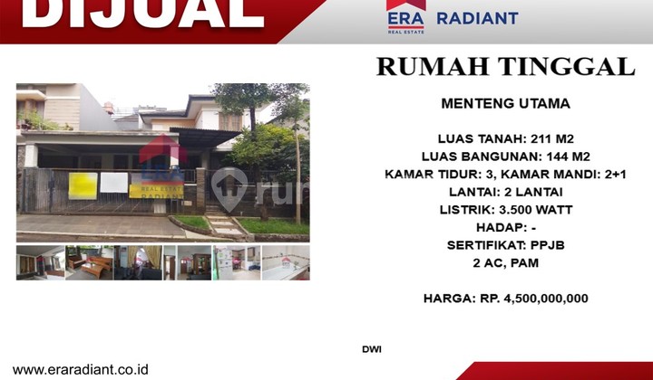 WTS : Dijual rumah tinggal cantik dan siap huni Menteng Utama Bintaro sektor 5 Spesifikasi Rumah Luas tanah 211 meter Luas Bangunan 144 meter Kamar Tidur 3 Kamar mandi 2 Kamar pembantu Kamar mandi pembantu Dapur Garasi Carport Status Kepemilikan SHM Lantai 2 Listrik 4400 Watt Harga 4.5 M nego