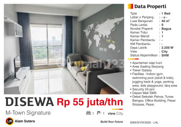 9-story apartment in Gading Serpong, Tangerang. Available for rent in a comfortable area. With the following specifications: - Bedrooms: 1 - Bathrooms: 1 - Certificate: Strata - Electrical Power: 2200 W - Furniture Condition: Furnished Fully equipped with facilities: - Sink. - Kitchen Set. - Refrigerator. - Air Conditioner. - Stove. - Swimming Pool. - Garden. - Swimming Pool. And this property stands out because: - Move-in Ready. - Flood-Free. - Fully Furnished. - Near Shopping Centers. - Near International Schools. - Near Universities. - Near Healthcare Facilities. - Located in the City Center. - City View. - Negotiable Property. - Strategic Location. The apartment's location is strategic, just steps away from various main and attractive facilities. For Rp. 4,583,333, you can immediately get the best apartment in the Gading Serpong area. Also available for yearly rental period.