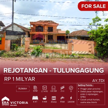 Provincial Roadside House. Large Land near Rejotangan Market, SMKN 1 Rejotangan Tulungagung, Gas Station. Suitable for Residence, Business, or Commercial Use. Specifications: Certificate: SHM (Freehold Title) Land Area: 470 m2 Building Area: 192 m2 2 Floors Bedrooms: 6 Bathrooms: 4 Carport: 3 Electricity: 1300W Water: PAM (Municipal Water) Orientation: North Price: 1 Billion AY, TDI-Artar