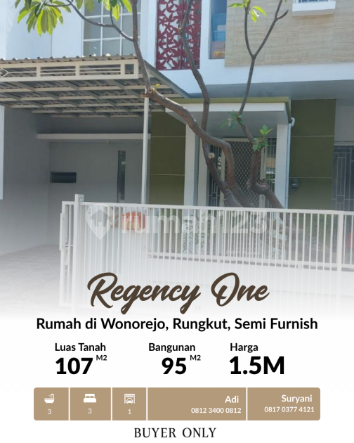 For Sale: Regency One Wonorejo Housing Semi-Furnished Dimensions: 8 x 13.5 m Land Area: 107 sqm Building Area: 95 sqm Bedrooms: 3 + 1 Bathrooms: 3...