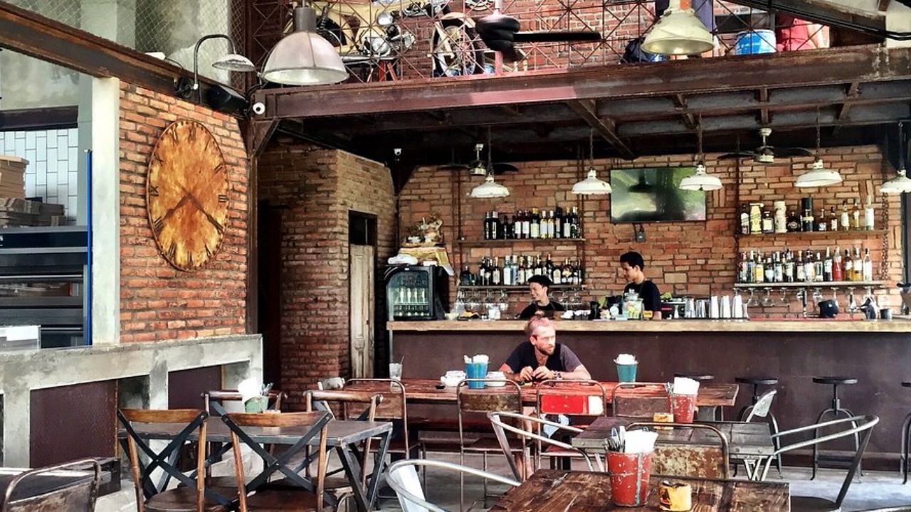 Restoran ini memiliki desain interior industrial rustic dengan sentuhan kayu dan batu bata yang membuat suasana terasa hangat dan kasual.