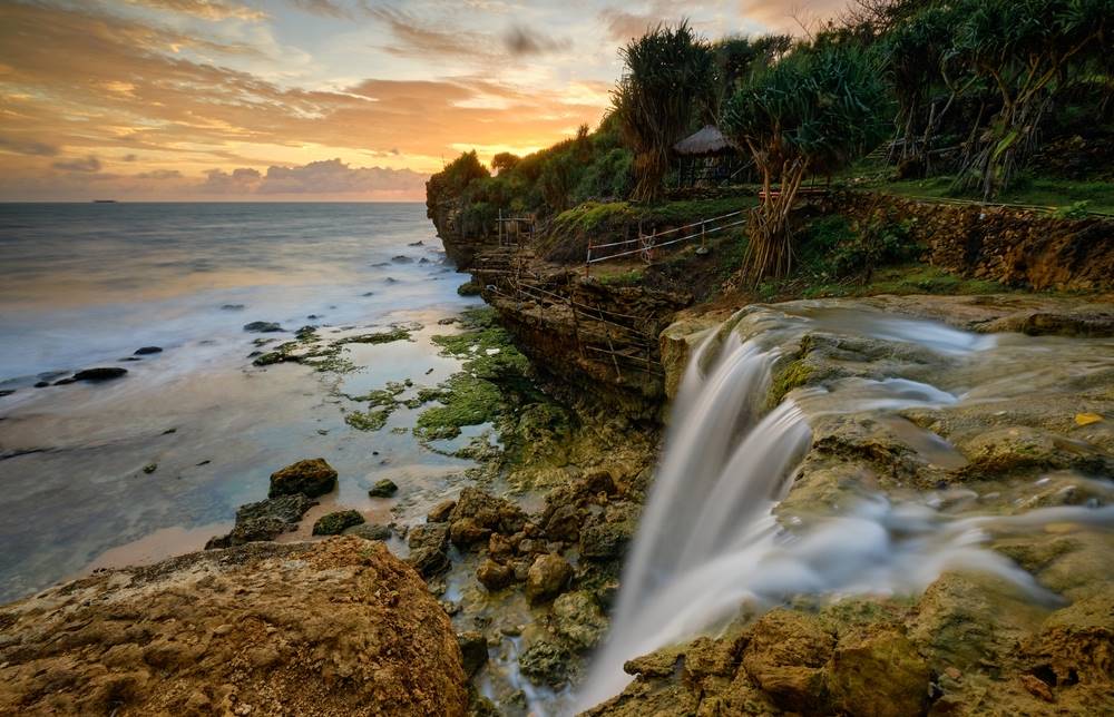 Seperti yang terlihat, Pantai Jogan memiliki air terjun yang mengalir langsung ke laut.