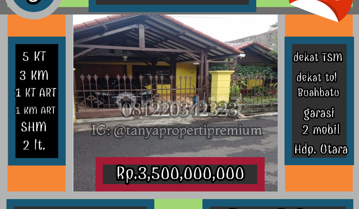 Lt 467 m2, Lb 350 m2 Lebar Muka +/- 18m Bentuk tanah kotak 7+3 Kt, 5 Km Garasi 2 mobil Carport 2 mobil Ada taman Listrik 3500 watt Air Pdam...