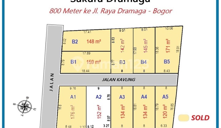 Lokasi tanah, maps : Cijujung, Kabupaten Bogor ******** KAVLING 1 - Luas Tanah : 200m2 - Lebar muka : 7,7 m - Lebar belakang : 6,44 m - Panjang ...