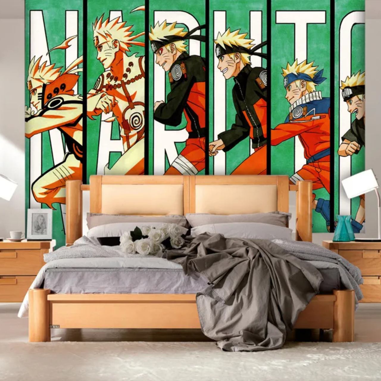 Dinding kamar ini dihiasi mural besar yang memperlihatkan transformasi Naruto dalam berbagai fase hidupnya.