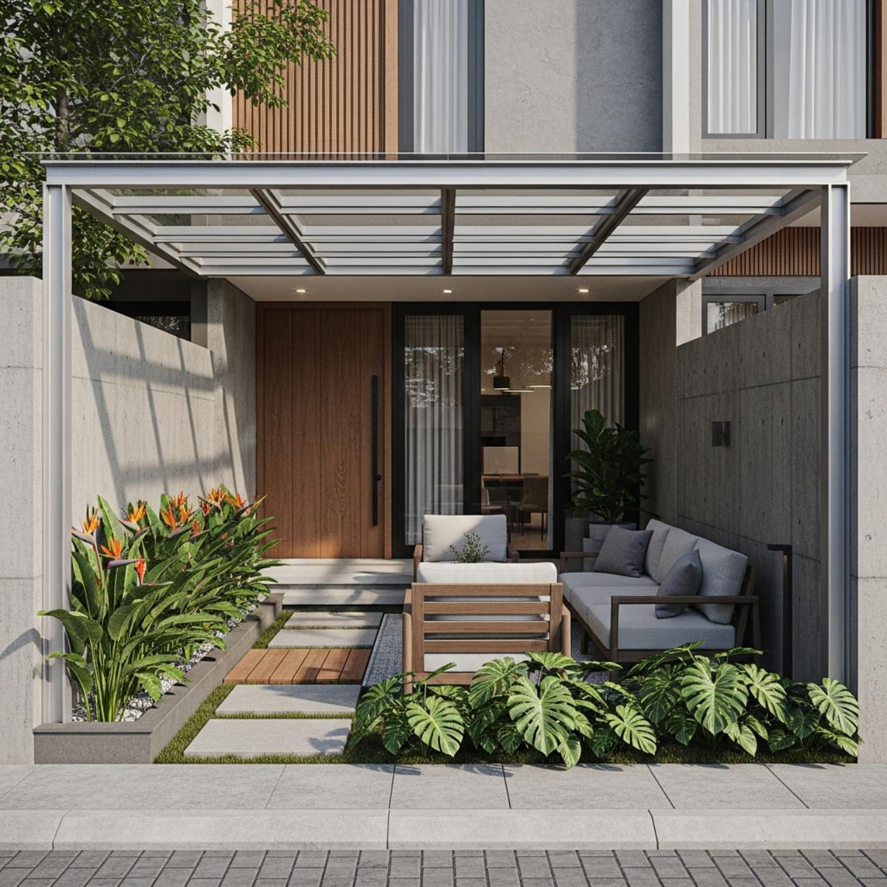 Kanopi baja ringan dengan penutup transparan melindungi area teras tanpa menghalangi cahaya alami.
