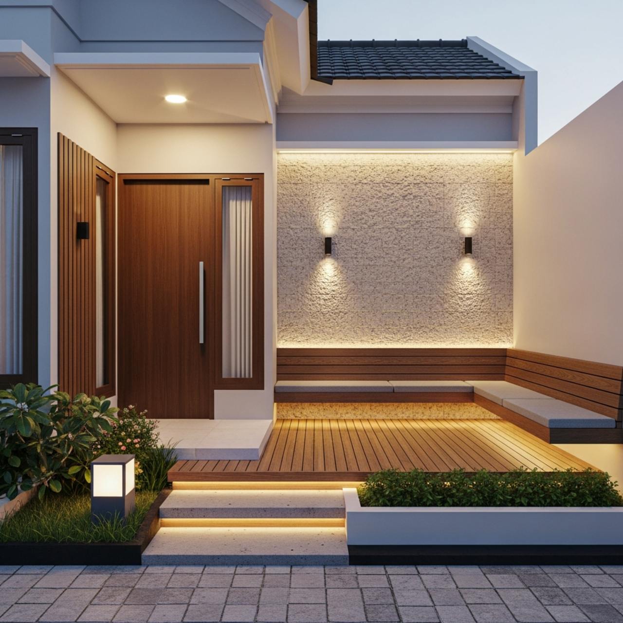 Fungsinya tidak hanya sebagai jalur masuk, tetapi juga tempat duduk santai, area berbincang singkat, hingga ruang menikmati udara luar tanpa harus keluar rumah sepenuhnya.