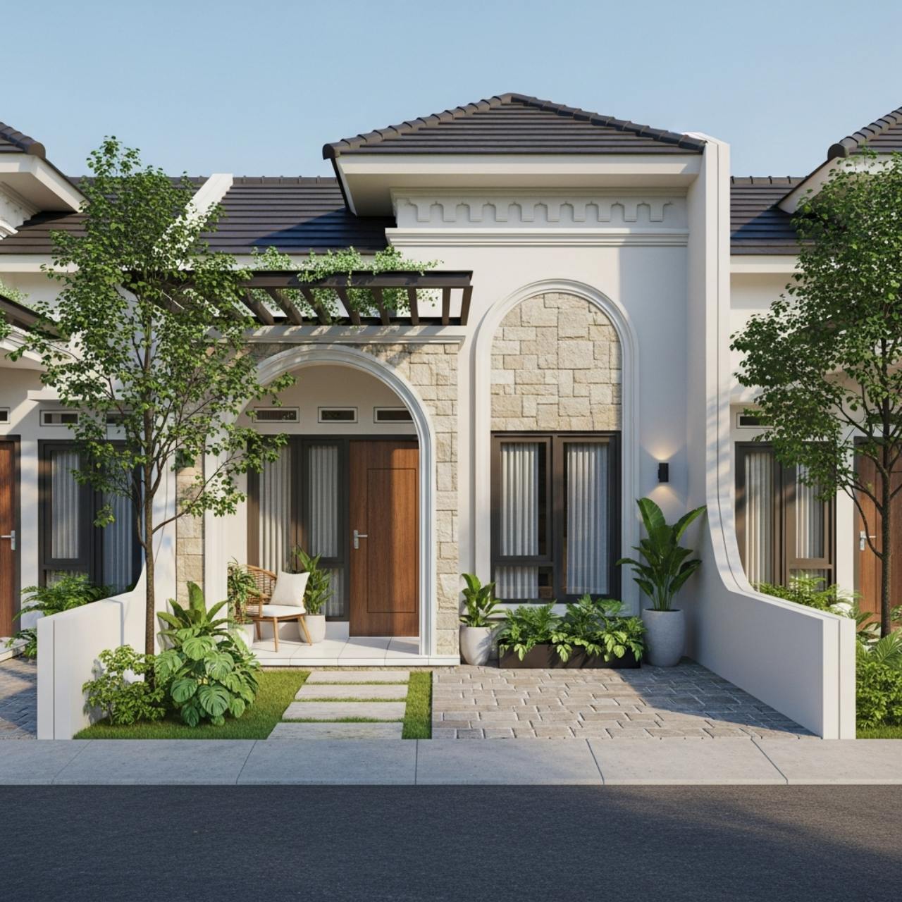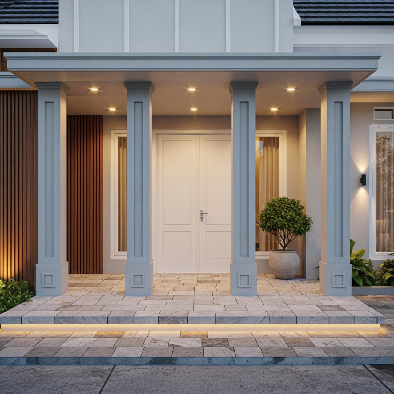 Pendekatan ini menunjukkan bahwa teras rumah modern dapat mengadopsi gaya klasik tanpa kehilangan kesederhanaan.