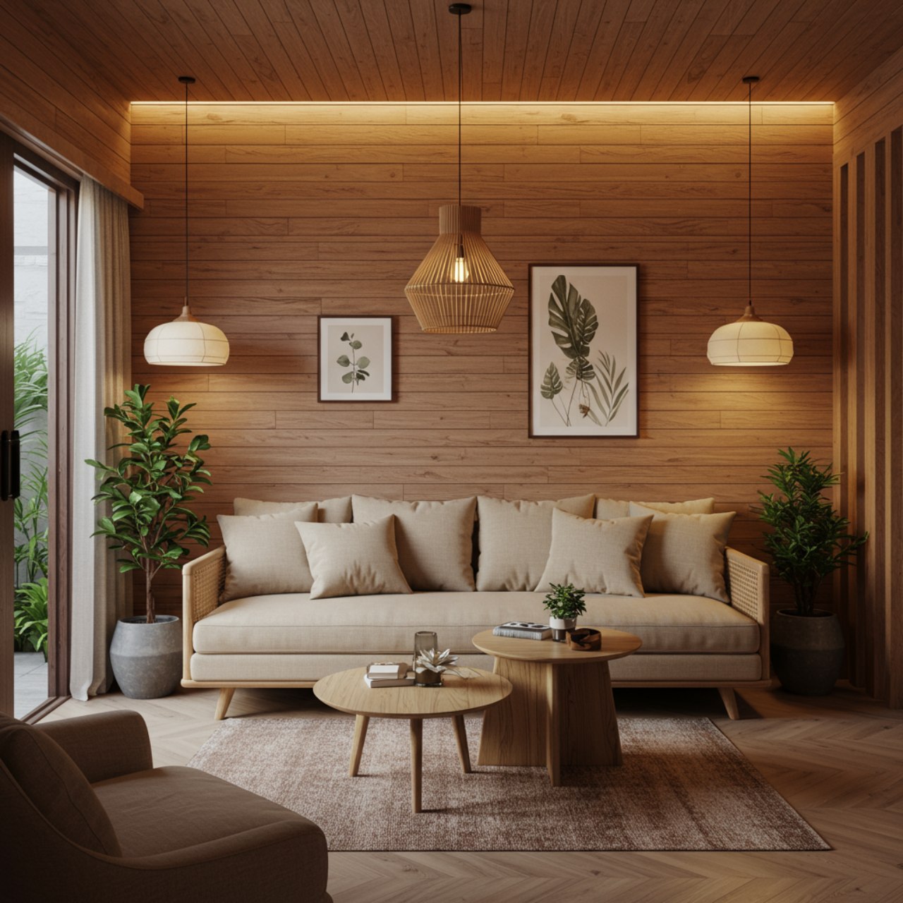 3. Ruang Tamu Natural Modern dengan Material Kayu