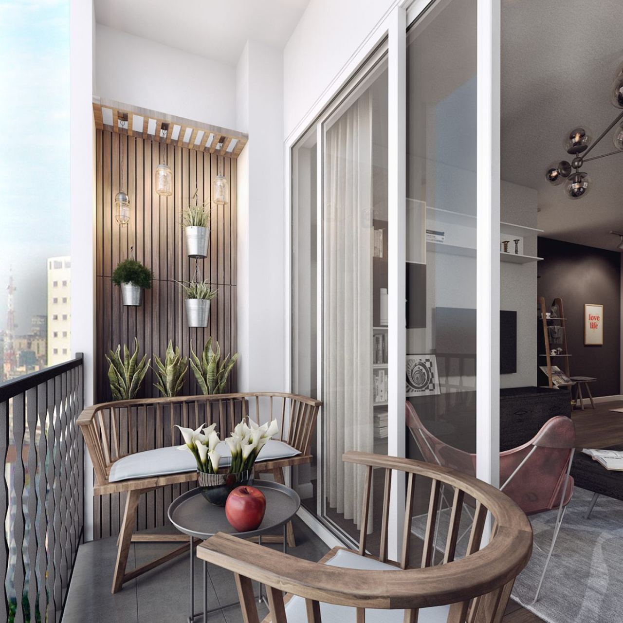 Salah satu hal menari dari balkon ini adalah dinding panel kayu vertikal dengan pot tanaman gantung yang menambah kesan alami.