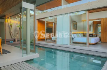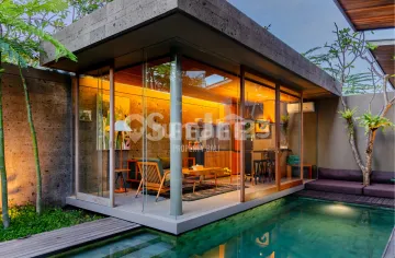 Modern 2-bedroom villa located in the prime area of Canggu, offering a comfortable layout with a private courtyard swimming pool. The design focuses on natural light, airflow, and privacy, creating a calm and well-balanced living environment. The living and dining area is positioned beside the pool and connected by full-height sliding glass doors, allowing seamless indoor and outdoor living. Warm wood ceiling accents combine with clean architectural lines to create a bright yet cozy atmosphere. Both bedrooms face the courtyard, providing direct views of the pool and greenery. The master bedroom features high ceilings and direct access to the pool deck, while the second bedroom is ideal for guests, family members, or a home office. Each bedroom comes with its own private bathroom finished in modern, easy-to-maintain materials. The inward-facing layout enhances privacy, making this villa suitable for personal residence or rental investment. Offered under leasehold title with an 80-year term, this property provides long-term security in one of Bali's most desirable areas. Located close to cafés, restaurants, beach clubs, and popular beaches, it combines lifestyle appeal with strong investment potential.