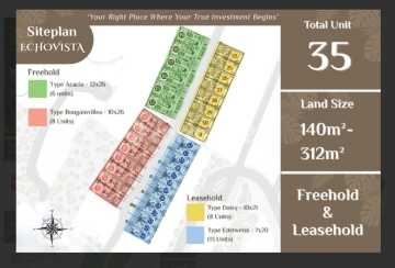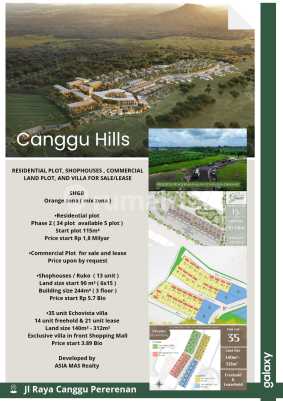 PreLaunching phase ketiga Canggu Hills : Villa Premium Freehold dan Leasehold berlokasi di depan Mall Canggu Hills Freehold Echovista villa 14 unit : -Type Acacia 6 unit [12 x 26] -Type Bougainvillea 8 unit [10 x 26 ] Leasehold villa 21 unit : -Type Daisy 8 unit [ 10 x 21] -Type Edelweiss 13 unit [ 7 x 20 ] === CANGGU HILLS RESIDENTIAL PLOT, SHOPHOUSE , COMMERCIAL LAND PLOT, AND VILLA FOR SALE/LEASE SHGB Orange zona ( mix zona ) -Residential Plot Phase 2 ( 34 plot , available 5 plot ) Start plot 115m² Price start Rp 1,8 Milyar -Commercial Plot / Tanah Kavling komersil for sale and lease Price upon by request -Shophouses / Ruko Available 13 unit Land size start 90 m² ( 6x15 ) Building size 244m² ( 3 floor ) Price start Rp 5.7 Bio -35 unit Echovista villa Land size 140m² - 312m² *Premium villa in front of Canggu Hills Shopping Mall* Price start 3.89 Bio Freehold villa 14 unit : -Type Acacia 6 unit [12 x 26] -Type Bougainvillea 8 unit [10 x 26 ] Leasehold villa 21 unit : -Type Daisy 8 unit [ 10 x 21] -Type Edelweiss 13 unit [ 7 x 20 ] Developed by ASIA MAS Realty