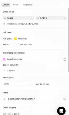 Dijual tanah di jalan utama pantai pererenan canggu. Kawasan resto / villa / dll. Lokasi dekat ke pantai pererenan, kurang lebih 700 meter jarak ke pantai. `Luas tanah 2.740 m2. `Lebar depan -+ 27 mtr. `Hadap timur. `SHM `ITR pariwisata. `Akses jln utama pantai pererenan. Harga 2,5 milyar per are. Google maps lokasi