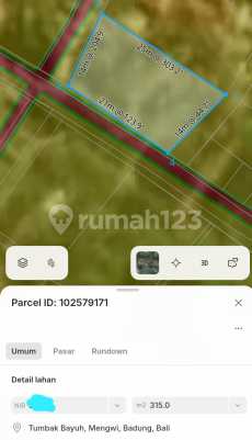 For Sale lahan langka luasan kecil di Jl. utama tumbak bayuh I Luas 315m² (3,15 are) Dapat 2 akses (hook) Zona kuning Lingkungan villa Harga 950jt/are