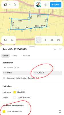 MURAH!!!!! & DAN JARANG ADA OCEAN VIEW KELILING BADARA DAN TOL JIMBARAN KUTA SELATAN DETAILS Luas tanah 4750 M2 lebar depan 64 Meter Hadap Utara posisi tanah tinggi jalan 5 Meter zona kuning Lokasi jl betel I nuansa selatan I dari arah taman griya terus naik ke atas sampai habis HARGA BUC Rp 380 juta/are