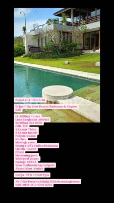 Dijual Vila / Freehold Di jual Vila View Pantai Jimbaran & Airport Bali Lt : 1100m2 / 11 Are Luas Bangunan : 800m2 Sertfikat Hak Milik IMB / SLF 4 Kamar Tidur 5 Kamar mandi Perpustakaan Kitchen Massage room Ruang staff : bagian belakang Listrik : 33.000 PDAM Swimming pool Whirpool jacuzy Hadap : UTARA View Jimbaran bay/airport Akses Jalan : 6 mter Harga : 25 M / NEGO Tpis Nb : Vila Tersewa Selalu Di klola management Hub : 08181877xxxxLily)