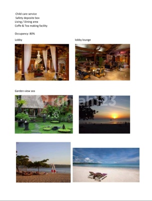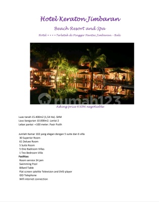 Dijual the kraton hotel and resort nusa dua jimbara kuta badung Luas tanah 1.90 HA (Hakmilik 1,54 HA + Sewa 36,70 are) Luas bangunan 15000 m2/150 are Tahun berdiri 1991 Jumlah kamar 102 unit Tipe kamar: Superior 36 m2 30 kamar Deluxe 40,50 m2 61 kamar Suite 60 m2 5 kamar One bed room villa 200 m2 5 kamar Two bed room villa 200 m2 1 kamar Fasilitas : Restaurant & Bar Meeting room Swimming pool Beach activity Spa & boutique Parkiran 15-20 mobil Air pdam & sumur bor Listrik 630 kva Generator 500 kva Harga Rp 350 milliar Minat hub Lili WA 081399617xxx/08561131xxx Note sewa mobil alexander