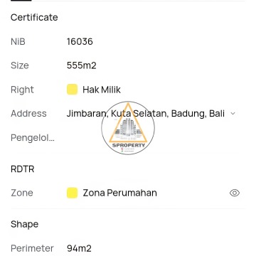 FOR SALE tanah di Jimbaran - Bali Dekat side walk mall, GWK, Pantai Jimbaran dan 25 menit ke airport Ngurah Rai Detail : • Luas tanah 5,55 are / 555 m² • Lebar depan 17,5 meter • SHM • ITR Permukiman (Kuning) • Lebar akses bervariasi 3.5-4.5 m (aspal, Paving dan tanah) • Jalur listrik dan air tersedia Harga IDR 550Jt / are / 100 m² negotiable.