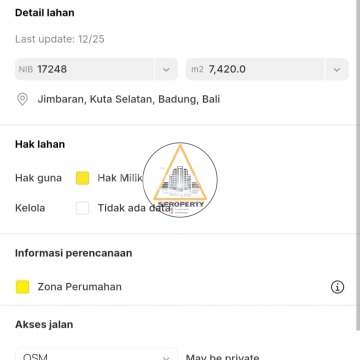 TANAH DEKAT KAWASAN PURI GADING JIMBARAN Lokasi berada pada posisi strategis yang dekat dengan Asian internasional school Taman Rama / Cluster elite Gading Kencana / Damara village & GWK - Luas tanah : 7.420 m² / 74,2 are - Posisi hook - Lebar depan sisi barat : 98 meter - Lebar depan sisi selatan : 54 meter - ITR Zona perumahan (Kuning) - Kontur tanah datar siap bangun - Jaringan PLN / PDAM / Wifi ada - Akses jalan lebar 8 meter - SHM (Sertipikat Hak Milik) Harga : Rp 375Jt / are / 100 m²