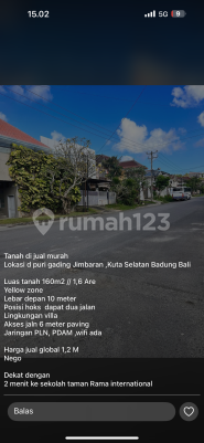 JUAL TANAH Puri gading Jimbaran LUAS 1,6 are harga 1.2 M global SHM PBB zona kuning jalan mobil siap bangun lingkungan villa dko ribun