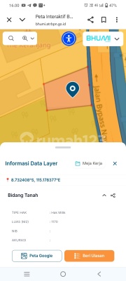 TANAH DIJUAL 11.7 ARE DI BAYPASS NGURAH RAI Tanah ini terletak di Jalan utama Baypass Ngurah Rai disamping The Keranjang Pusat Oleh Oleh Bali. Tidak jauh dari Bandara, tanah ini cocok untuk dibangun kantor. Detil Property: SHM Luas tanah: 11.7 Are Lebar depan: 35 m Panjang: 43 m Zona: Commescial Perdagangan dan Jasa Hadap: Timur Ok Harga: IDR 2.5 Milyar/Are Dropped pin ********