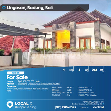 Rumah Cantik, Akses Jalan Besar, View GWK, Dekat Ke Pantai For Sale - Jual Rumah Goa Gong Ungasan, Kuta Selatan, Badung, Bali Harga. Rp 240000xxxxJual) Deskripsi Properti. Rumah Cantik, Akses Jalan Besar, View GWK, Dekat Ke Pantai Luas Tanah. 350 m2 Dimensi. 14x25 Luas Bangunan. 350 m2 Sertipikat. SHM Kamar Tidur. 4 Kamar Mandi. 3 Garasi Mobil. 0+2 Hadap / View. Selatan LOCAL X Kelapa Gading ******** ⓪②① ②⑨⓪⑥ ⑧⑤⑨⑤ P3KPG-0000xxxx-JW-J