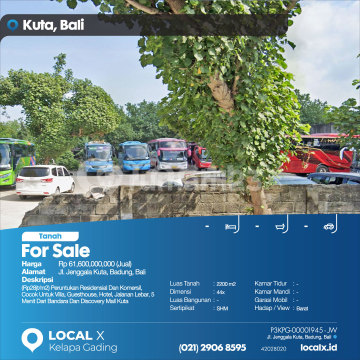 (Rp28jt/m2) Peruntukan Residensial Dan Komersil, Cocok Untuk Villa, Guesthouse, Hotel, Jalanan Lebar, 5 Menit Dari Bandara Dan Discovery Mall Kuta For Sale - Jual Tanah Jenggala Kuta, Badung, Bali Harga. Rp 6160000xxxxJual) Deskripsi Properti. (Rp28jt/m2) Peruntukan Residensial Dan Komersil, Cocok Untuk Villa, Guesthouse, Hotel, Jalanan Lebar, 5 Menit Dari Bandara Dan Discovery Mall Kuta Luas Tanah. 2200 m2 Dimensi. 44x Luas Bangunan. 2200 m2 Sertipikat. SHM Kamar Tidur. - Kamar Mandi. - Garasi Mobil. - Hadap / View. Barat LOCAL X Kelapa Gading ******** 0212906xxxx P3KPG-0000xxxx-JW-J