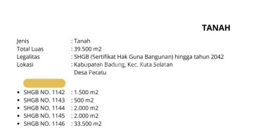 TANAH Jl. Pantai Tanjung Simah , Pecatu, Uluwatu, Kabupaten Badung, Bali 80361 Spesifikasi = Legalitas : SHGB - Luas : 38.500 m2 - Kondisi : sesuai foto - Lokasi : berada nol hadap pantai Tanjung Simah Kuta - Harga : 270 miliar (dibawah nilai pasar) ------------- Info : Adi 08531441xxxx