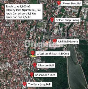 TANAH DI NGURAH RAI Jual Tanah BY PASS NGURAH RAI - Badung LT 3800 Rp 98.800.000.xxx SHM Hadap Timur Tanah di depan jalan By Pass Ngurah Rai Lokasi di pusat keramaian dan pembelanjaan antara lain : Krisna Oleh -Oleh, Mall Bali Galleria Mercure Hotel , The Keranjang 10 menit ke Airport 5 menit Toll Bali Mandara