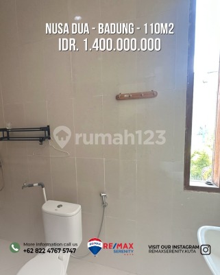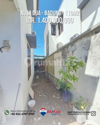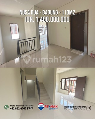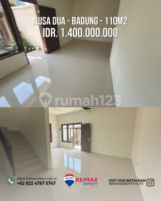 Spesifikasi : Luas tanah 110m2 Luas bangunan 86m2 3 Kamar Tidur 2 Kamar mandi Ruang Keluarga Dapur Gazebo Carport Hadap Barat Akses Jalan 5 meter Dekat dengan Fasilitas Umum Legalitas SHM Selling Point 6 Menit menuju ITDC 11 Menit Menuju Ke Waterblow Benoa 22 Menit Menuju Bandara I Gusti Ngurah rai Harga Rp 1.4M Cash/Kredit