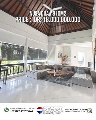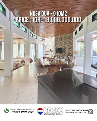 Detail Properti - Luas Tanah: 910 m² (9,1 Are) - Luas Bangunan: 800 m² - Sertifikat: SHM (Freehold) - IMB / SLF: 2016 - Fully Furnished 6 Kamar Tidur 6 Kamar Mandi Garasi 2 Mobil Kolam Renang Pribadi Kolam Ikan Listrik 13.200 Watt Akses Jalan 5 Meter (Paving) Lokasi Strategis - Dekat Pantai Pandawa - Dekat Kempinski Nusa Dua - ± 20 menit ke Bandara Ngurah Rai Harga : Rp 18 Miliar
