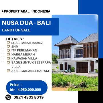 Dijual lahan murah di Nusa dua Bali. berada di kawasan villa. Dengan lebar depan 35 meter bagus untuk dibagi menjadi beberapa unit Lokasi Ocean Blue - Nusa Dua Details • Luas tanah 9 are ( 900 m2 ) • SHM • ITR perumahan • Lebar depan 35 meter • Akses jalan lebar 5 meter • Kawasan villa Harga Rp 550.000.xxx / are ( Rp 5.5 juta / m2 ) ********