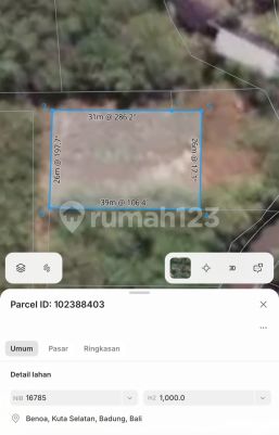 TANAH DIJUAL MURAH DIBAWAH PASAR Lokasi : Sawangan NusaDua Bersebelahan Dengan Villa dancing Detail - Luas 1000 m2 / 10 are - Zona Kuning Perumahan - Lebar depan 39 meters - SHM - Akses 5 meters - Lingkungan Villa, Hotel, Perumahan,Dll - Akses listrik ,air tinggal sambung HARGA 350 Juta / Are / 100m2 3.5 Juta / m2 Dn58