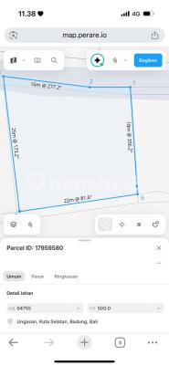 JUAL TANAH OCEAN VIEW – UNGASAN, KUTA SELATAN Lokasi Premium Jl. Tundun Penyu, Ungasan – Badung, Bali Hanya 300 meter dari Jl. Pantai Balangan Spesifikasi Tanah Luas total : 900 m² / 9 are (2 SHM – 5 are & 4 are, dijual global) Dimensi : 44 x 22 meter Hadap : Utara Bentuk : Melebar (bisa dipotong roti, semua kavling dapat akses jalan utama) Akses jalan : Aspal 5 meter Zona kuning, perumahan Legalitas : SHM (Sertifikat Hak Milik) Harga Rp 700 Juta/are