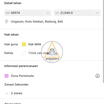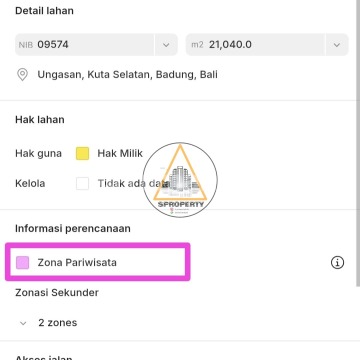 LAND FOR LEASEHOLD NEAR SAVAYA BEACH CLUB AND KARMA KANDARA RESORT Only a 5-minute drive to Melasti Beach and many luxury villas already under construction • Global land area 2.1 hectares / 21,040 m² • Frontage width 154 meters • Flat land contour ready to build • ITR Tourism Zone (Pink) • 5-meter-wide asphalt road access • Minimum take land area 50 are / 5,000 m² (Frontage width 35 meters) Direct Owner Price: IDR 30 million / are / year, negotiable.
