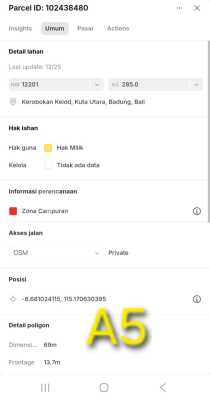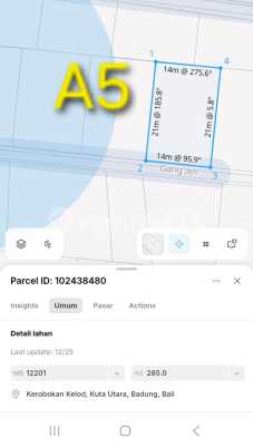 PRIME LOCATION IN SEMINYAK : Dijual Tanah Kavling Lokasi Strategis di Jalan Bidadari Seminyak Kuta Bali Dekat Aleva Villa / Hotel Dafam Savvoya / Fave Hotel / Warung Pak Malen Berjarak 400 Meter ke Jln Induk Sunset Road Berjarak 200 Meter ke Jln Mertanadi Kuta Cocok Untuk Villa / Apartement / Guest House / Minimarket / Coffe Shop / Hunian / Dikavling Sisa 2 kavling : block A4 = 286m2 dan block A5 = 285m2 - lebar depan 14 meter - hadap selatan - akses jalan 6 meter Harga 13.750 juta/m2