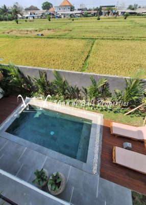 ******** Villa Information Quiet and secure area Security deposit required Brand new villa Rice field view Kitchen equipped Balcony Hot water Swimming pool Flat TV 2 minutes drive to shops and restaurants 7 minutes drive to beach Two floor building with 3 bedrooms Rental Price Rp 275.000.xxx/year Outdoor Water Pump Small Garden Swimming Pool Gazebo Balcony Garage Sunbed Living room Couch Ceiling fan Enclosed living room Kitchen Equipped Kitchen Dining Table Refrigerator Water Dispenser Stove Bedroom Air con Bed Console table Wardrobe Bathroom Toilet Shower Hot water