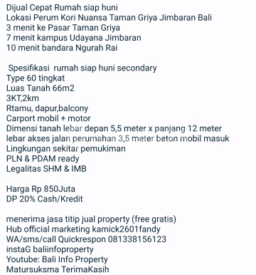 Dijual Cepat Rumah siap huni Lokasi Perum Kori Nuansa Taman Griya Jimbaran Bali 3 menit ke Pasar Taman Griya 7 menit kampus Udayana Jimbaran 10 menit bandara Ngurah Rai Spesifikasi rumah siap huni secondary Type 60 tingkat Luas Tanah 66m2 3KT,2km Rtamu, dapur,balcony Carport mobil + motor Dimensi tanah lebar depan 5,5 meter x panjang 12 meter lebar akses jalan perumahan 3,5 meter beton mobil masuk Lingkungan sekitar pemukiman PLN & PDAM ready Legalitas SHM & IMB Harga Rp 850Juta DP 20% Cash/Kredit menerima jasa titip jual property (free gratis) Hub official marketing kamick2601fandy WA/sms/call Quickrespon 0813xxxxxxxx instaG baliinfoproperty Youtube: Bali Info Property Matursuksma TerimaKasih