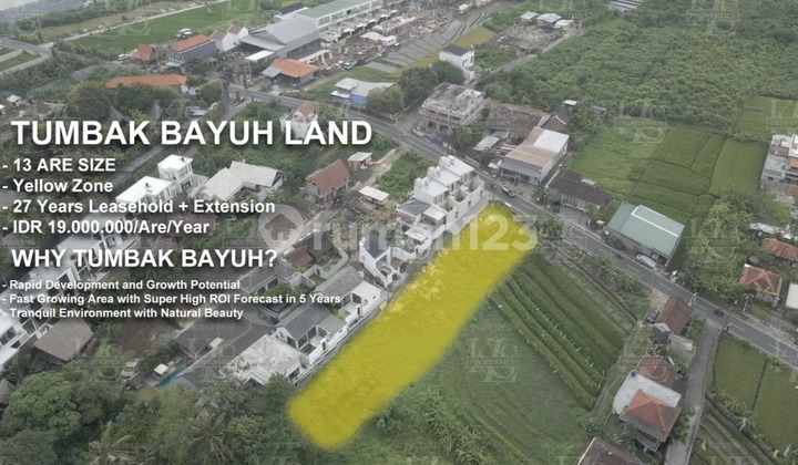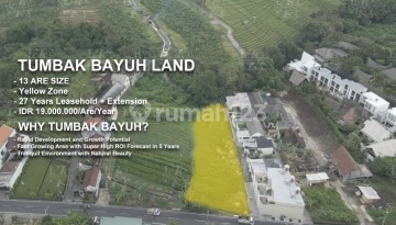 Description Explore a unique investment opportunity with 13 Are of land located in the rapidly developing area of Tumbak Bayuh. This land is positioned in a Yellow Zone, offering a 27-year leasehold for those looking to secure a stake in one of Bali's fastest-growing regions. The tranquil environment and natural beauty make it an ideal location for future developments or personal projects. Location Tumbak Bayuh, Bali Tumbak Bayuh is emerging as a sought-after destination for investors and developers, known for its picturesque landscapes and serene surroundings. 13 Are of land available for lease Convenient access to nearby attractions and amenities Nestled in a natural setting, offering a peaceful retreat Property Features Key Features of the Land in Tumbak Bayuh Size: 13 Are Leasehold: 27 years + Extenstioon Price: IDR 19,000,000/Are/Year Yellow Zone: Ideal for various development projects Rapid Development: Positioned in a fast-growing area Investment Benefit Exceptional ROI Potential in a Thriving Area Investing in this land in Tumbak Bayuh offers an incredible opportunity for growth. With a super high ROI forecast within 5 years, this area is rapidly evolving, making it a prime spot for investment. Tranquil environment with natural beauty High demand for property in developing areas Promising rental and resale potential